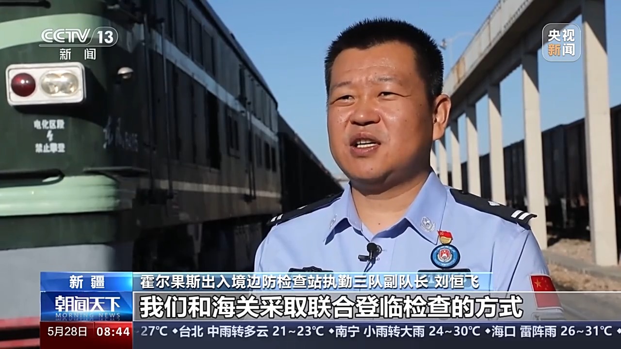 霍爾果斯出入境邊防檢查站執勤三隊副隊長 劉恒飛:我們和海關采取聯合登臨檢查的方式對班列車體進行檢查,查驗出入境司乘人員和貨物基本是同步進行,30分鐘內即可完成查驗。