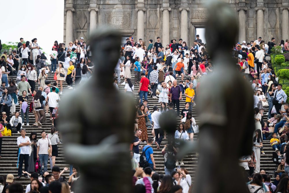 5月1日,游客在澳門(mén)大三巴牌坊前游覽。新華社記者 張金加 攝