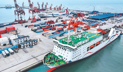 今年以來,山東省榮成市石島管理區通過推廣“海運直航+跨境電商+海外倉”等發展模式,全力做好貨物承攬。圖為日前,石島新港口岸,貨輪在裝卸集裝箱貨物。