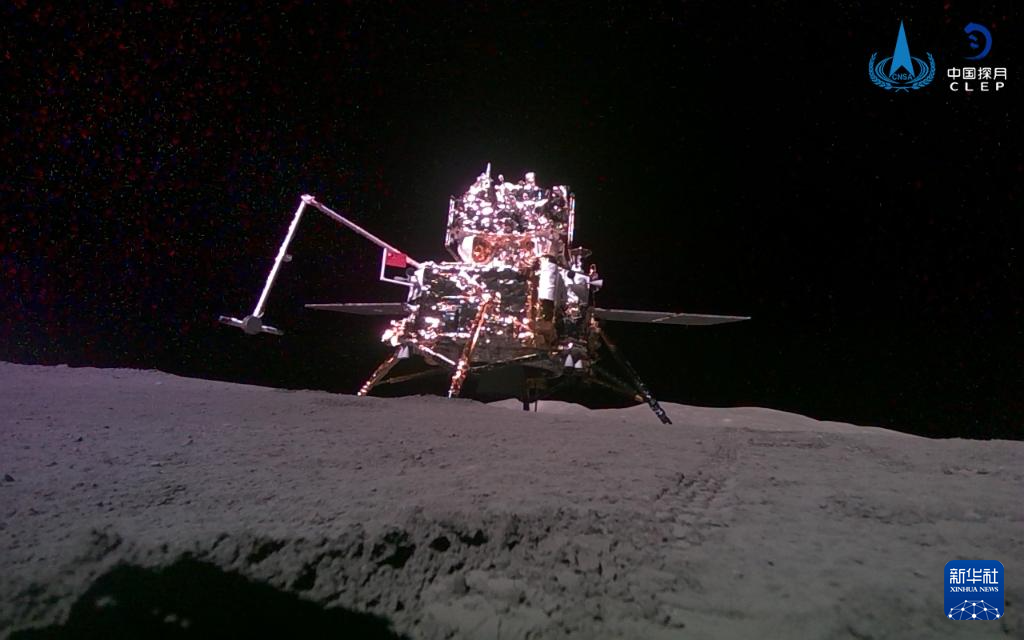 6月3日,嫦娥六號攜帶的“移動相機”自主移動后拍攝并回傳的著陸器和上升器合影。新華社發(國家航天局供圖)