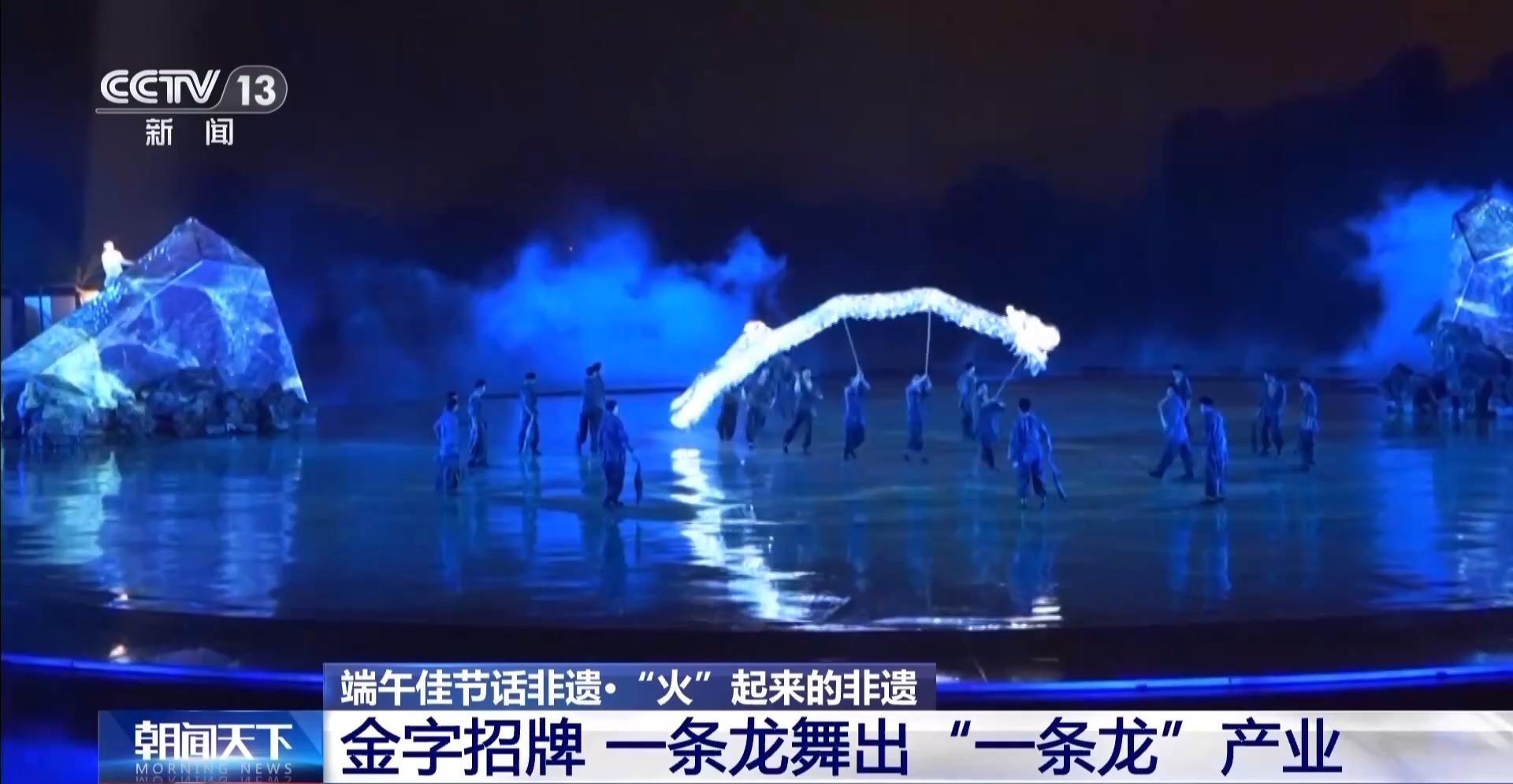 非遺的核心技藝在生產(chǎn)實踐中得到傳承。眼下,光是龍燈扎制業(yè)務,已經(jīng)遍布全國十幾個省份,平均每年訂單超過1000萬元。如今,扎制好的龍燈,更多是被用在當?shù)氐凝埼璞硌萆稀_@是大型非遺山水實景劇《追夢 銅梁龍》的演出現(xiàn)場,觀眾可以看到水云龍、荷花龍等十幾種銅梁傳統(tǒng)龍舞,其中壓軸戲,便是銅梁火龍。