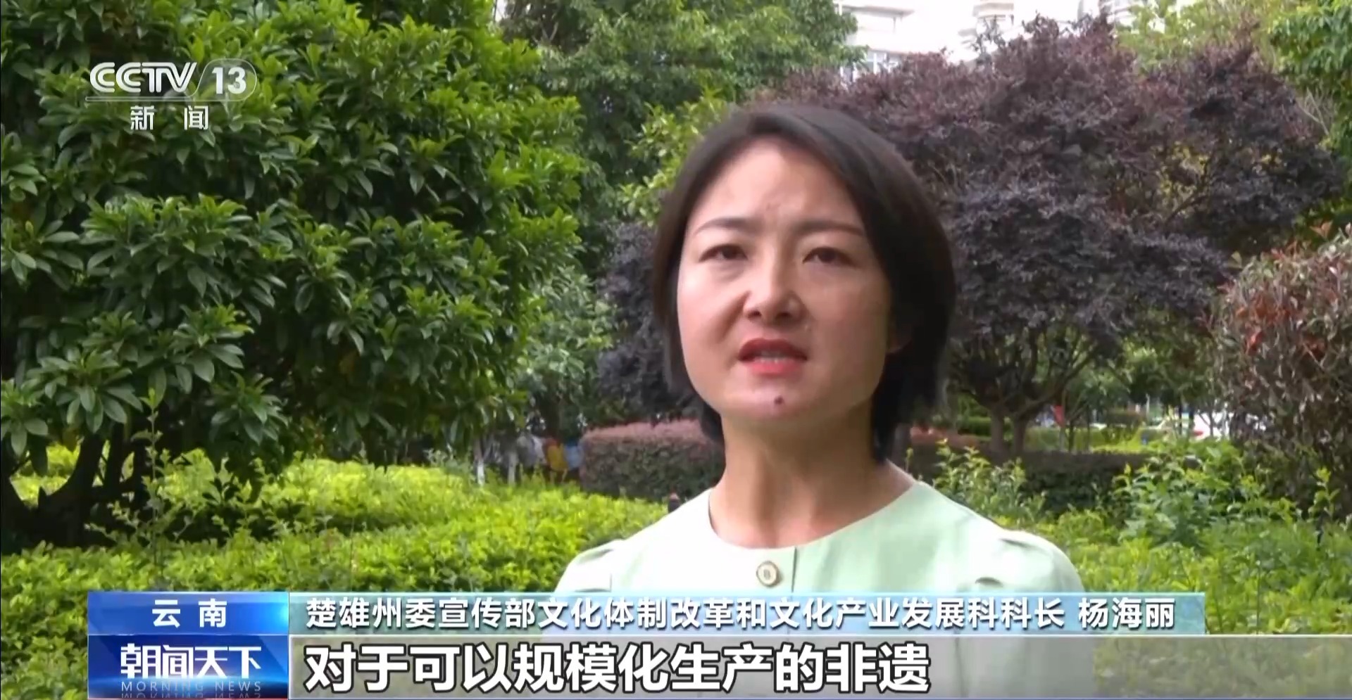 楚雄州委宣傳部文化體制改革和文化產(chǎn)業(yè)發(fā)展科科長 楊海麗:對于可以規(guī)模化生產(chǎn)的非遺,我們提倡生產(chǎn)性保護。適當引導非遺工藝加大與創(chuàng)意設(shè)計的融合力度,推動產(chǎn)品開發(fā)向多元領(lǐng)域拓展,變成文化產(chǎn)品、時尚產(chǎn)品、潮流產(chǎn)品。