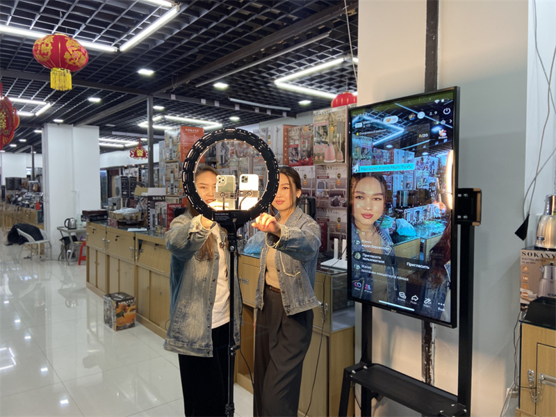 “市面上的五金產(chǎn)品,在我直播間都可以買到,都是‘中國制造’?!敝鞑グ⒁栏駸崮尽す葎e克正在用俄語、哈薩克語等多種語言進(jìn)行跨境直播帶貨。