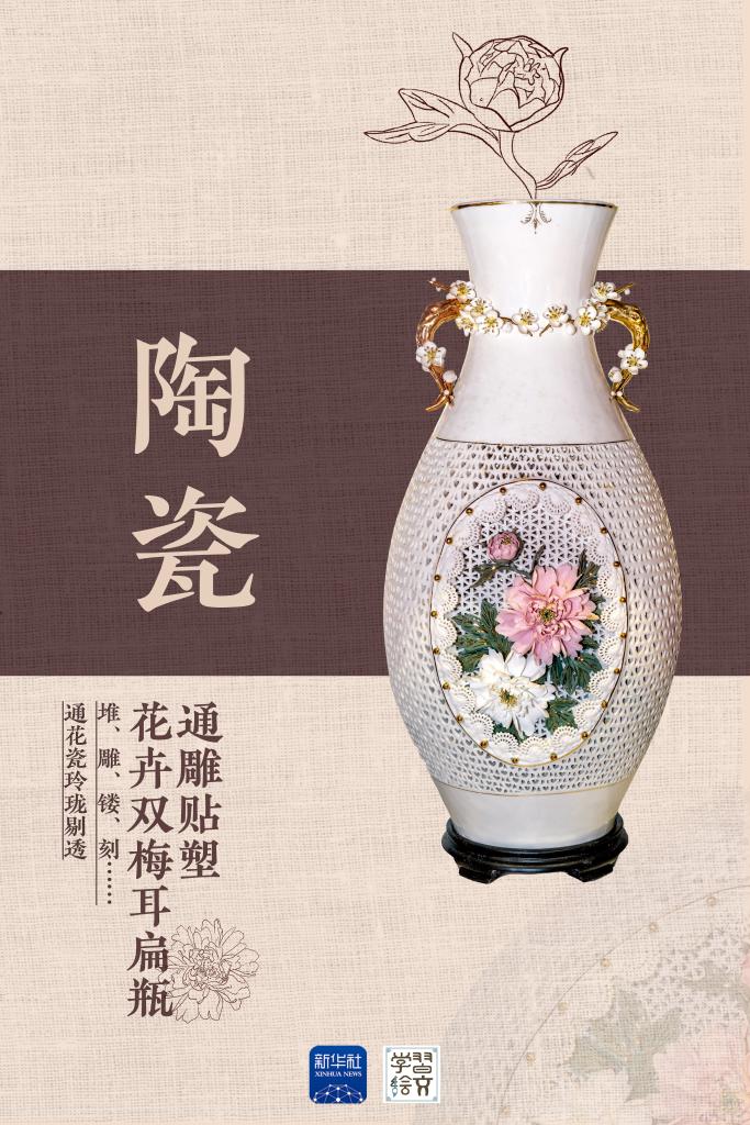 通花瓷器鏤空可達5層之多,或施于釉上彩繪,或與浮雕、立雕相結合,或配以色土、腐蝕金等裝飾,玲瓏剔透,娟麗秀美。有的瓷瓣片下水不沉,落地不碎。