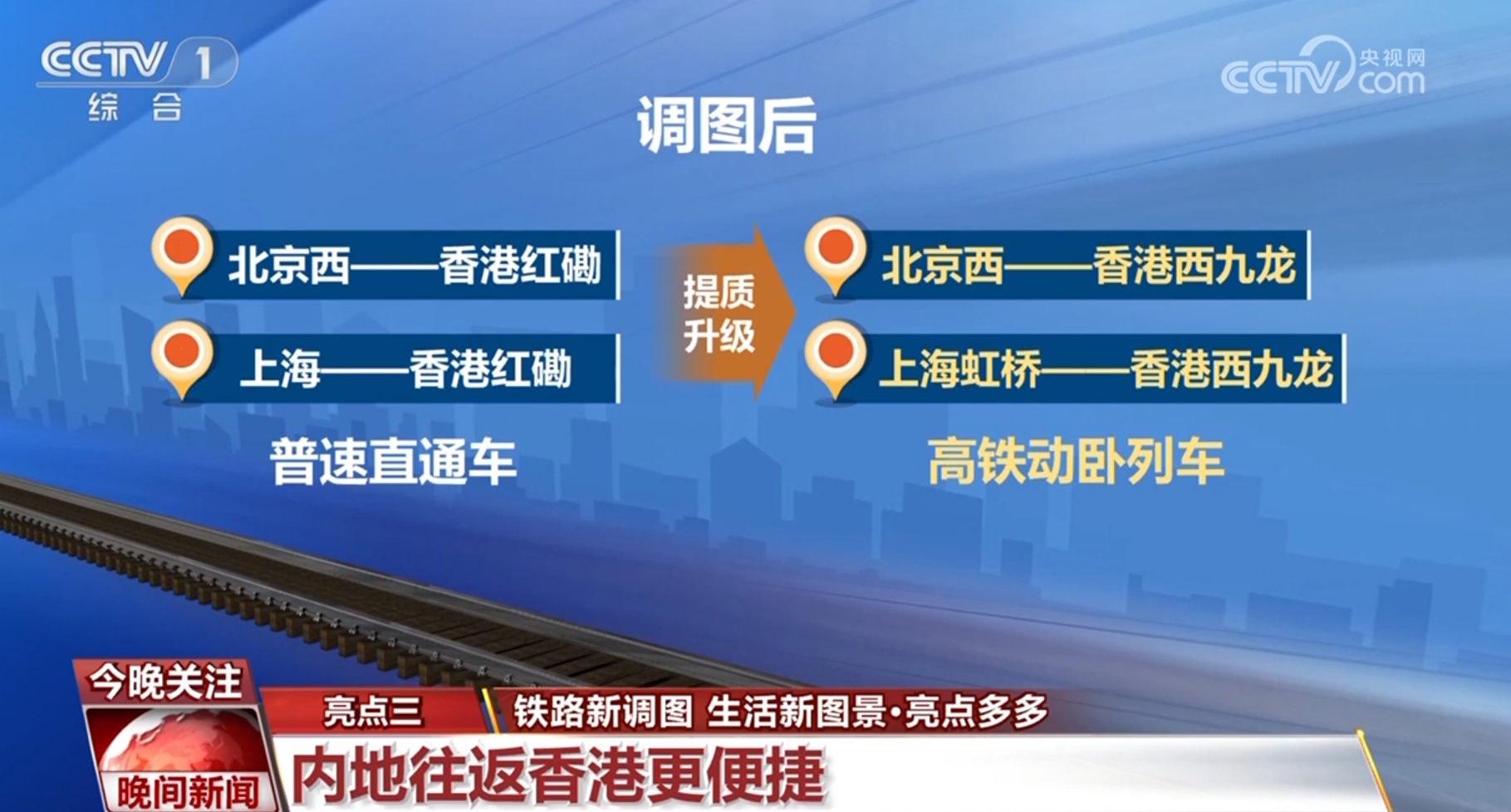 調圖后,北京西、上海與香港紅磡站間開行的普速直通車,提質升級為北京西、上海虹橋與香港西九龍站間的高鐵動臥列車。北京至香港的全程旅行時間由原來的24小時31分壓縮至12小時34分,上海到香港從19小時34分壓縮至11小時14分。京港、滬港間實現夕發朝至,動臥的出行方式更可省去一晚酒店費用。