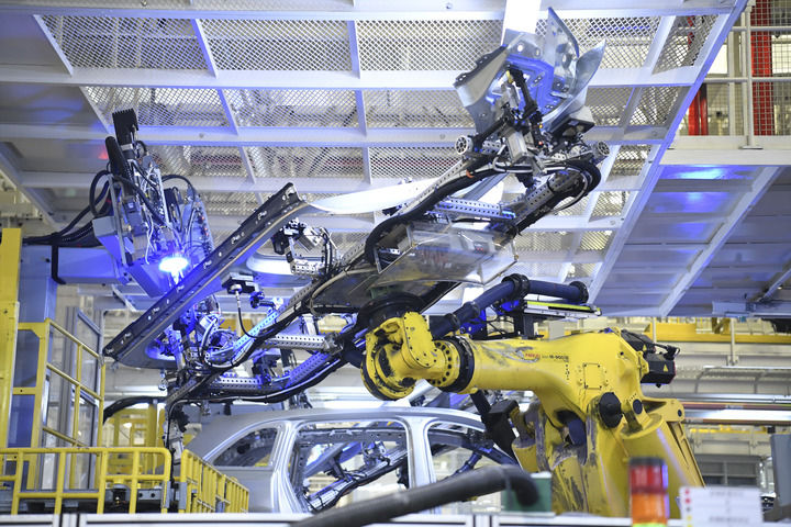 江蘇常州理想汽車智能制造基地焊裝車間的機械臂正在作業(5月31日攝)。新華社記者 柳文惠 攝