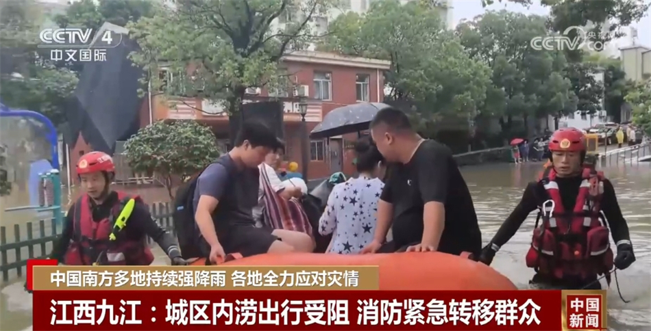 23日,江西九江遭遇強降雨,城區出現積水內澇,部分路段積水深超一米,居民出行受到影響。當地消防救援人員利用橡皮艇幫助群眾轉移,同時,消防救援人員使用浮艇泵,連接水帶,開展排水作業。
