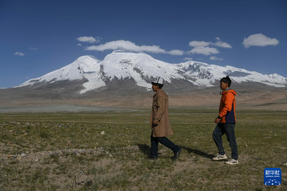 7月6日,塔西巴伊(右)和父親加尼拜克路過慕士塔格峰腳下的牧場。新華社記者 胡虎虎 攝