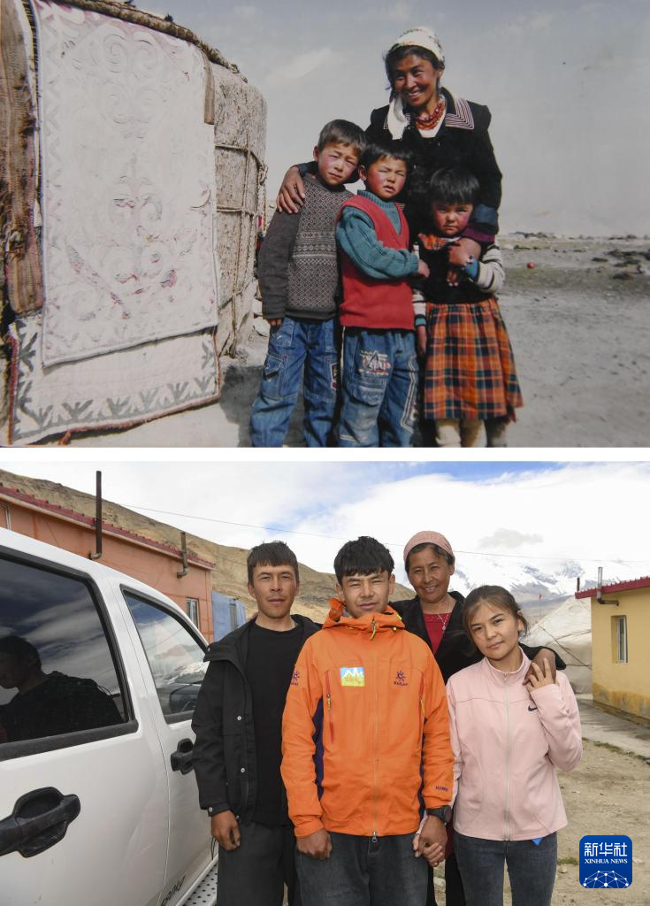 拼版照片:上圖為國外登山隊于2007年8月22日為塔西巴伊(前中)、哥哥(前左)、妹妹(前右)、母親在慕士塔格峰下牧場氈房旁拍攝的合影(7月5日翻拍資料照片);下圖為2024年7月5日塔西巴伊(前中)、哥哥(前左)、妹妹(前右)、母親在慕士塔格峰下新居前拍攝的合影(新華社記者胡虎虎攝)。新華社發