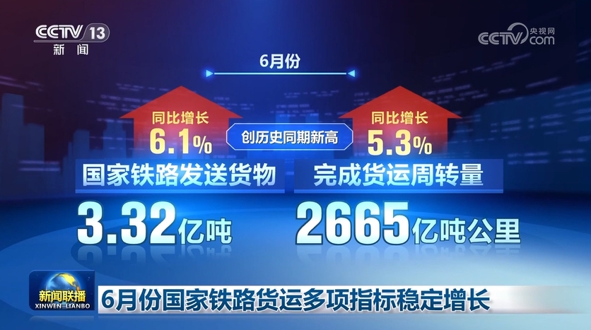 國鐵集團數據顯示,6月份,國家鐵路發送貨物3.32億噸,完成貨運周轉量2665億噸公里,同比分別增長6.1%、5.3%,創歷史同期新高。目前,我國鐵路貨運量、貨運周轉量等指標穩居世界首位。