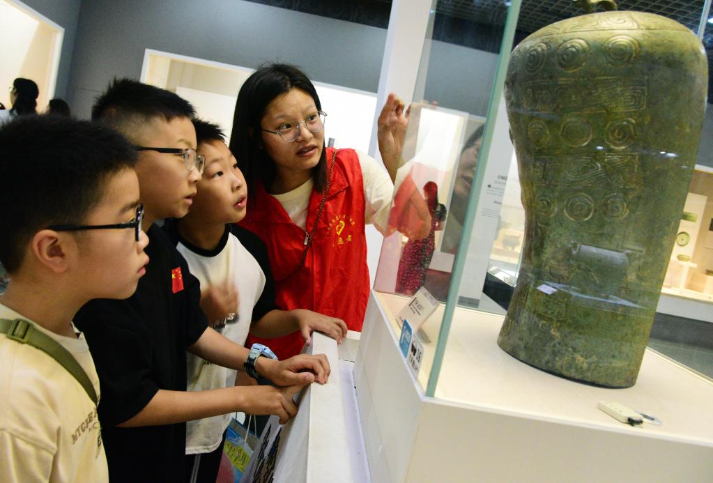 7月14日,在江蘇省鎮江博物館,江蘇大學志愿者為小朋友介紹文物。新華社發(石玉成 攝)