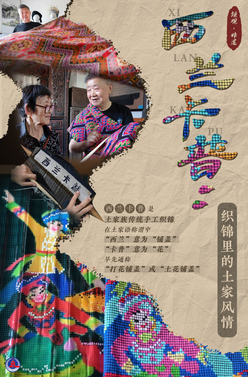 西蘭卡普是土家族傳統(tǒng)手工織錦,在土家語稱謂中,“西蘭”意為鋪蓋,“卡普”意為花,早先通稱“打花鋪蓋”或“土花鋪蓋”。土家孩子出生時(shí)外婆要送織錦,嬰幼兒時(shí)要蓋織錦,女孩子自小學(xué)習(xí)織錦,出嫁時(shí)在織機(jī)上制作西蘭卡普作為陪嫁。西蘭卡普記錄了土家族的風(fēng)俗和情感,與土家人的生活息息相關(guān),被譽(yù)為土家族的“五彩活化石”,2006年被列入國家級(jí)非物質(zhì)文化遺產(chǎn)名錄。