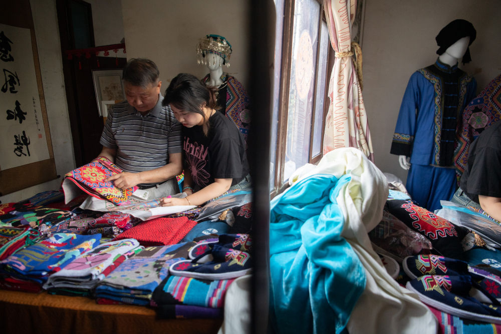 7月2日,唐洪祥整理用西蘭卡普制作的土家服飾。