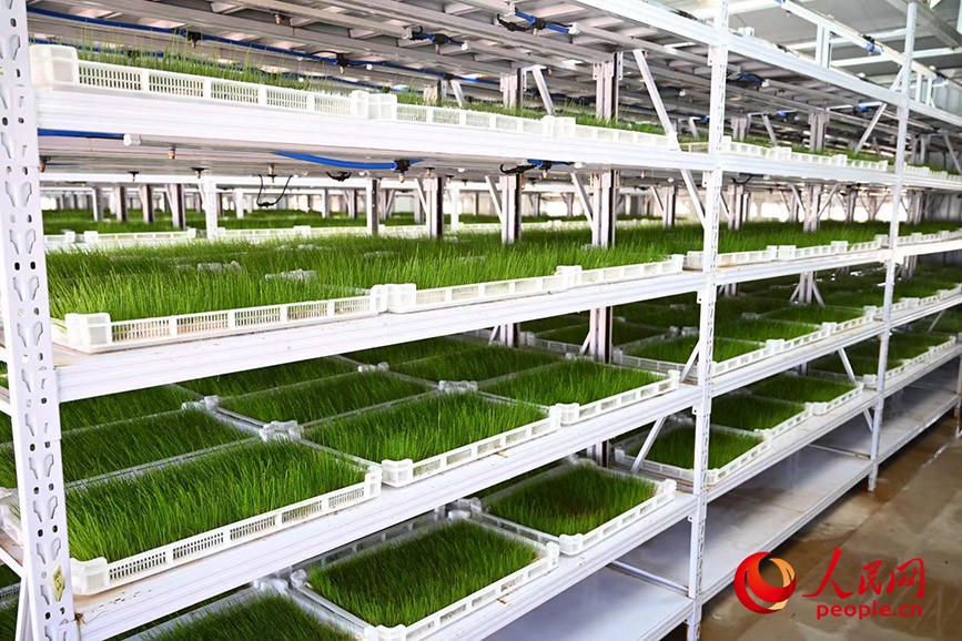 除了飼養蘇尼特羊的棚圈之外,牧場中還設計了一座溫室房,里面整齊排列的架子上,種植著郁郁蔥蔥的燕麥草,這里被牧民親切地稱為“空中牧場”。