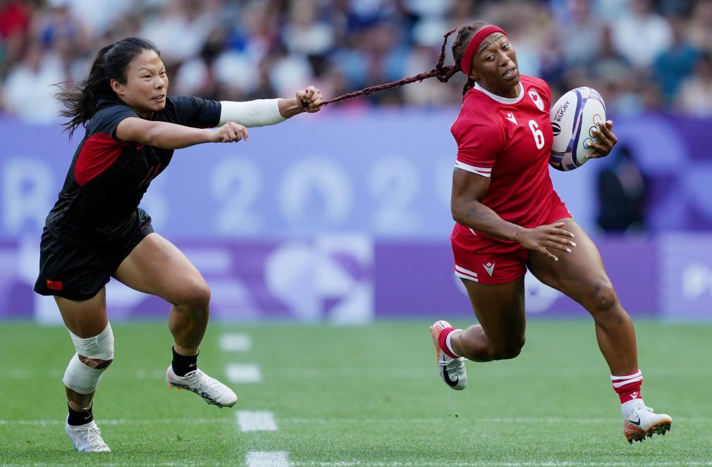 7月29日,中國隊球員劉瀟倩(左)與加拿大隊球員夏麗蒂·威廉姆斯在比賽中。當日,在巴黎奧運會七人制橄欖球女子分組循環賽A組比賽中,中國隊17比26不敵加拿大隊。 新華社記者 呂小煒 攝