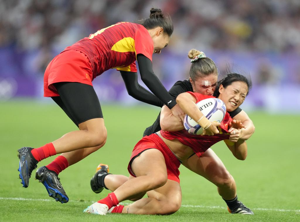 7月29日,中國隊球員胡宇(前)在比賽中。 當日,在巴黎奧運會七人制橄欖球女子四分之一決賽中,中國隊5比55不敵新西蘭隊。 新華社記者 呂小煒 攝