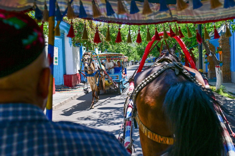 在伊犁哈薩克自治州伊寧市喀贊其民俗旅游區,游客乘坐馬車觀光游覽(7月27日攝)。