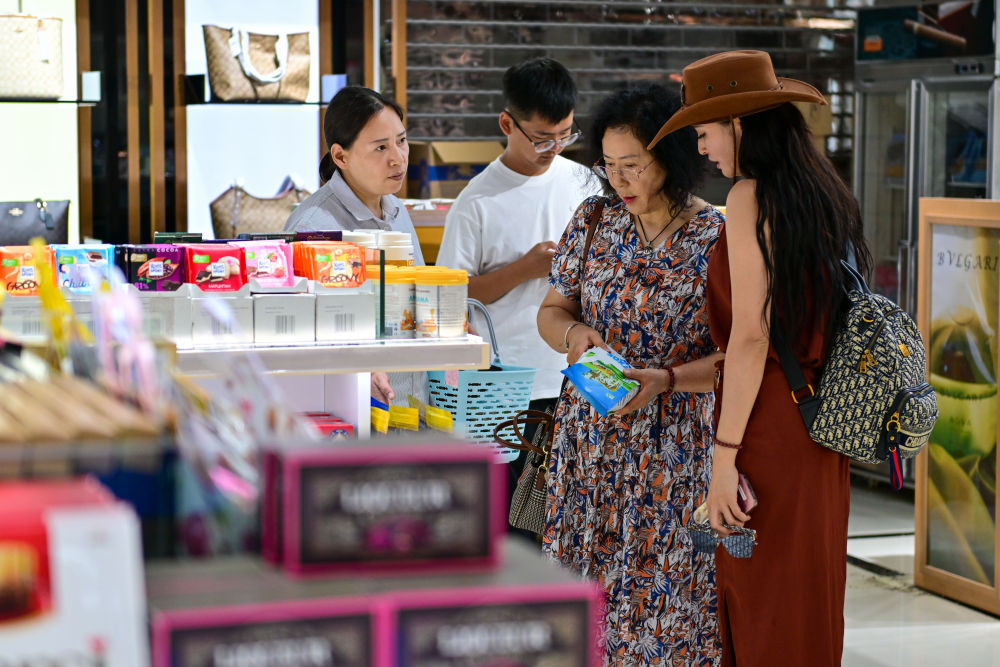 在中哈霍爾果斯國際邊境合作中心,游客在免稅店挑選商品(7月26日攝)。