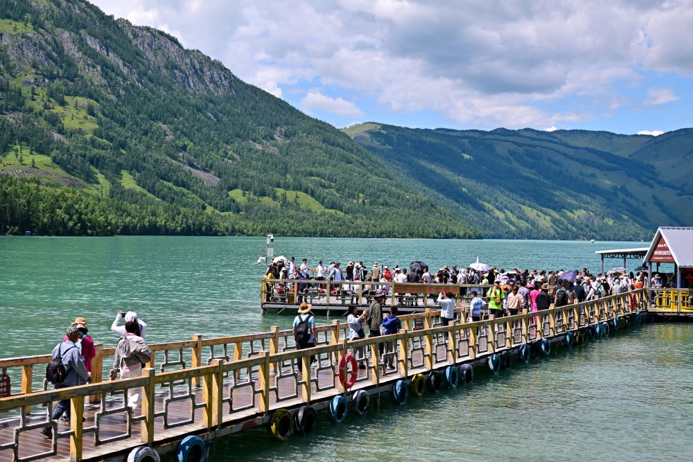 游客在新疆阿勒泰地區喀納斯景區觀光游覽(7月22日攝)。