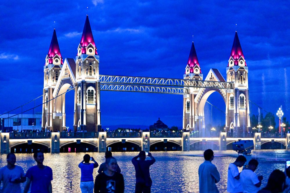 在伊犁哈薩克自治州伊寧市喀贊其民俗旅游區,游客在特色民宿拍照打卡(7月27日攝)。