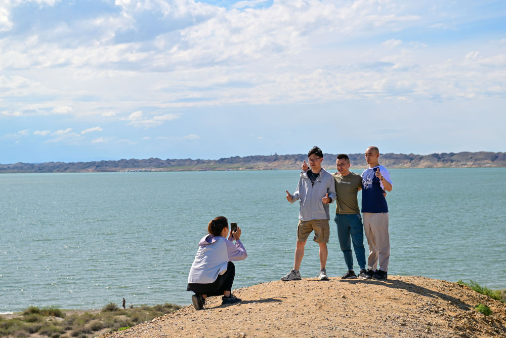 游客在新疆阿勒泰地區福海縣烏倫古湖合影留念(7月21日攝)。
