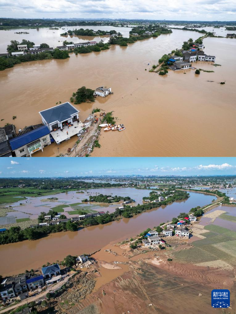 拼版照片:上圖為7月29日12時拍攝的湖南省湘潭縣易俗河鎮四新堤決口現場(無人機照片);下圖為7月30日16時拍攝的湖南省湘潭縣易俗河鎮四新堤決口現場(無人機照片)。新華社記者 陳思汗 攝