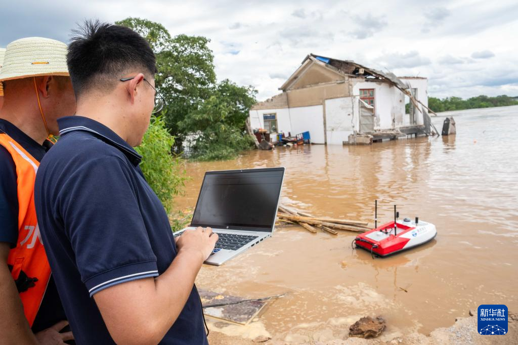 7月29日,在湖南省湘潭縣易俗河鎮四新堤決口現場,水利部門工作人員在測量決口附近的水深、流速等信息。新華社記者 陳思汗 攝