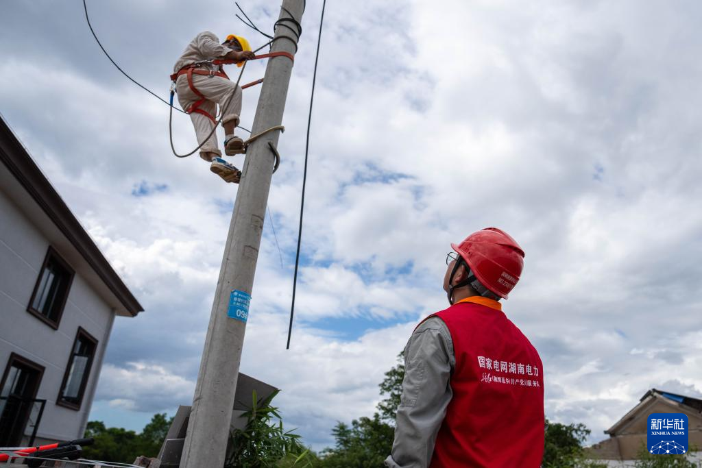7月29日,在湖南省湘潭縣易俗河鎮四新堤決口現場,搶險人員在處理決口附近的電線。新華社記者 陳思汗 攝