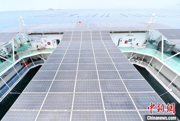 登上平臺頂層的露天平臺,由上而下鋪陳開來的巨大光伏電板引人注目。福建投資開發集團有限公司戰略發展部總經理黃慧湄介紹,“閩投1號”平臺由海洋可再生能源提供電力,搭載的光伏發電和儲能電池實現多能互補的綠色能源供電系統,可長期穩定地為平臺生產生活、休閑旅游提供能源支撐,并實現零碳或低碳排放。