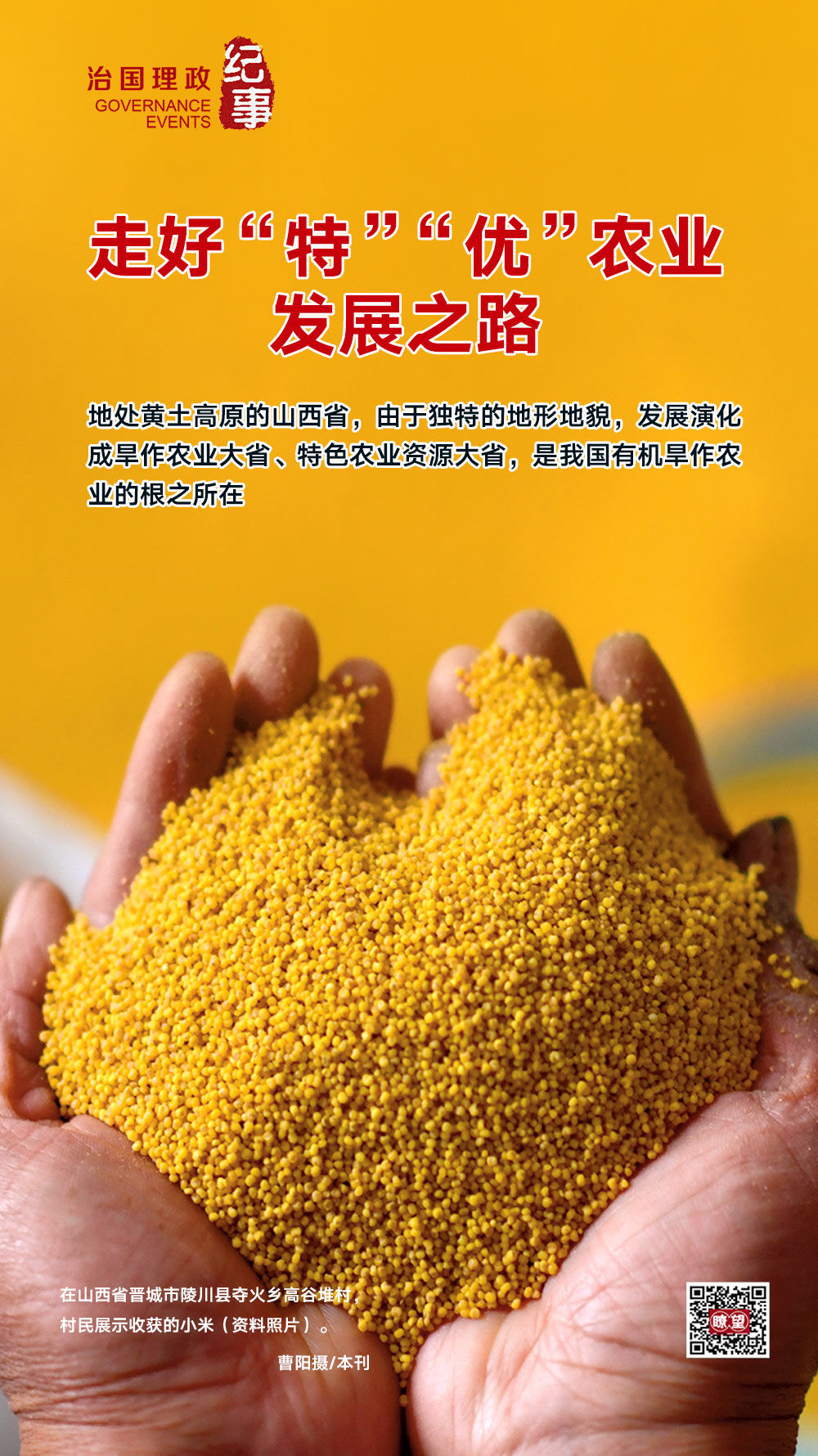 ◇2020年5月,習近平總書記在山西考察時強調,山西山多地多、地貌多元、氣候多樣,這種獨特的資源稟賦決定了山西農業的出路在于“特”和“優”。要深入推進農業供給側結構性改革,提高農業綜合效益和競爭力。