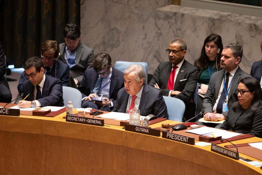 2月23日,在位于紐約的聯合國總部,聯合國秘書長古特雷斯(前排中)在烏克蘭問題高級別公開會上發言。烏克蘭危機升級兩周年之際,聯合國安理會23日舉行烏克蘭問題高級別公開會,與會多方呼吁通過政治手段解決烏克蘭危機。新華社記者謝鍔攝