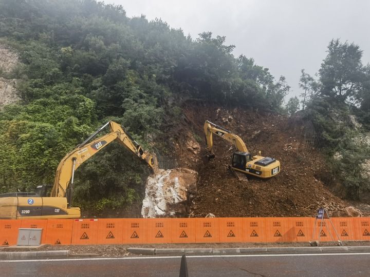 8月6日,大型機械設備在清理位于吉林省集安市下解放村一處山坡上的“落石”。新華社發