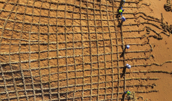 治沙工人在寧夏中衛市境內的騰格里沙漠鋪設刷狀網繩式草方格沙障(2024年5月30日攝,無人機照片)。