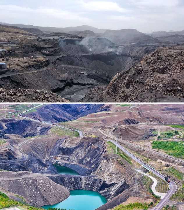 拼版照片,上圖為:位于寧夏石嘴山市的賀蘭山石炭井礦區(2017年5月30日攝,新華社發);下圖為:2024年8月6日拍攝的修復治理后的賀蘭山石炭井礦區(無人機照片,新華社記者馮開華攝)。