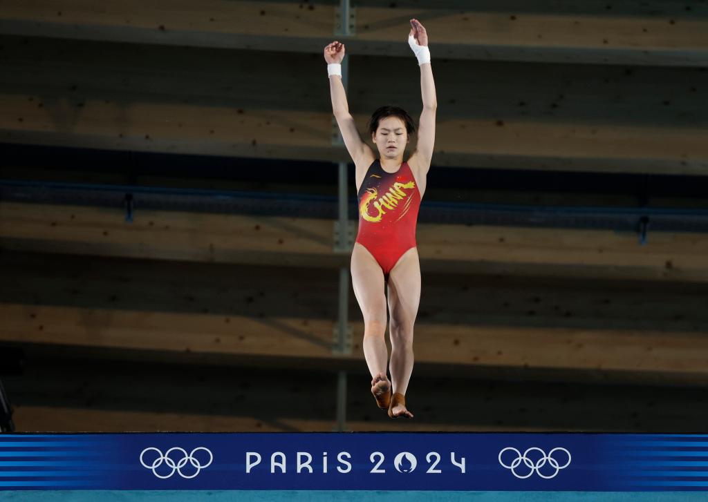 8月5日,中國選手全紅嬋在巴黎奧運(yùn)會跳水女子10米臺半決賽中。新華社記者 張玉薇 攝