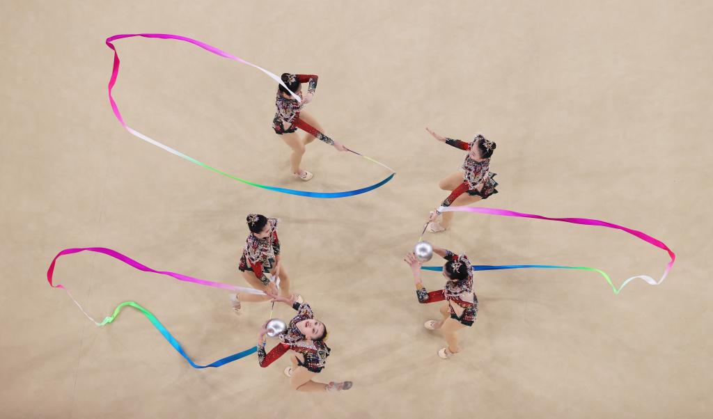 8月10日,中國隊在巴黎奧運(yùn)會藝術(shù)體操項目集體全能決賽中。新華社記者 郭昱 攝