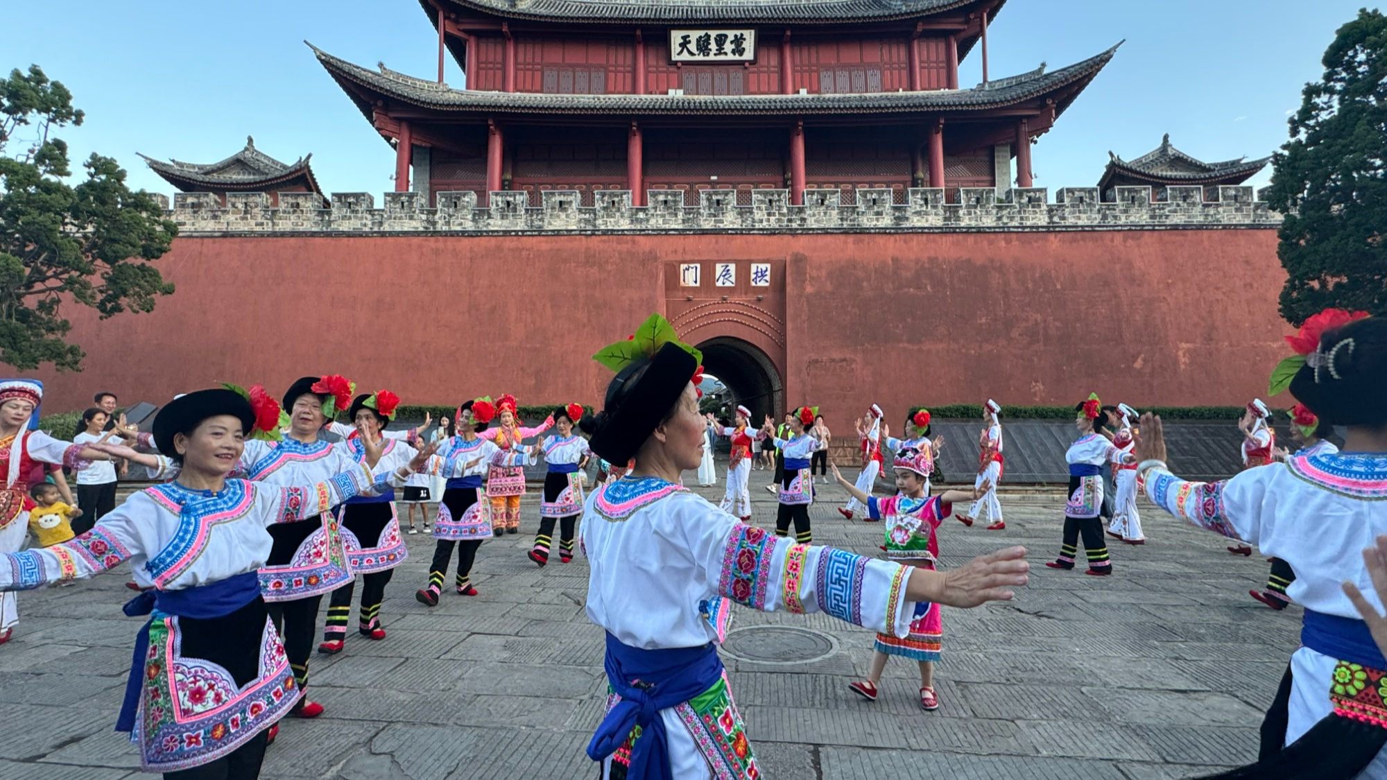 在巍山古城拱辰樓廣場,經(jīng)常有“法治匯演”在這里上演。昨天,巍山的幾只民族文藝隊表演了《白族霸王鞭》舞蹈、《平安巍山》快板、《是你》聲樂、《阿克哩哈》舞蹈等節(jié)目,巧妙地將普法內(nèi)容融入到其中,以歌舞傳遞法治的力量,群眾載歌載舞,現(xiàn)場氛圍濃烈。