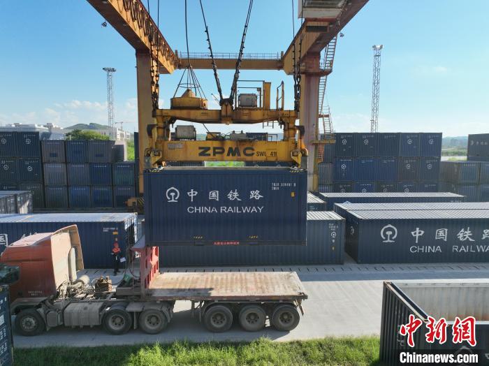 8月26日,廣西南寧國際鐵路港內,鐵路職工頂著下午的烈日,正在為發往越南的貨運班列裝卸貨物。該鐵路港是廣西始發中越班列的核心場站。國鐵南寧局提供的信息顯示,今年前7個月,廣西始發中越班列累計發運貨物6850標箱,同比增長16倍;其中7月份發運1922標箱,超過今年一季度發運量總和,為今年以來第三次刷新單月發運量紀錄。圖為集裝箱擺滿場站,等待裝車。王以照 攝