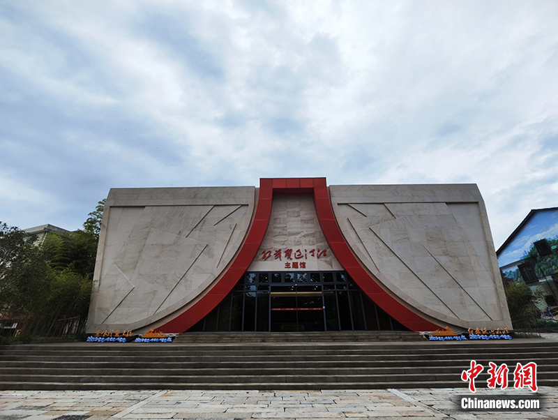 在當年擺渡人們行舟悠游來去的渡口旁,一棟造型奇特的建筑映入采訪團的眼簾——展館整體結構形如“四”字,寓意“紅四軍”,中間紅色砌磚組成“八一”字樣,九面旗幟浮雕象征九條船載著紅軍渡江。