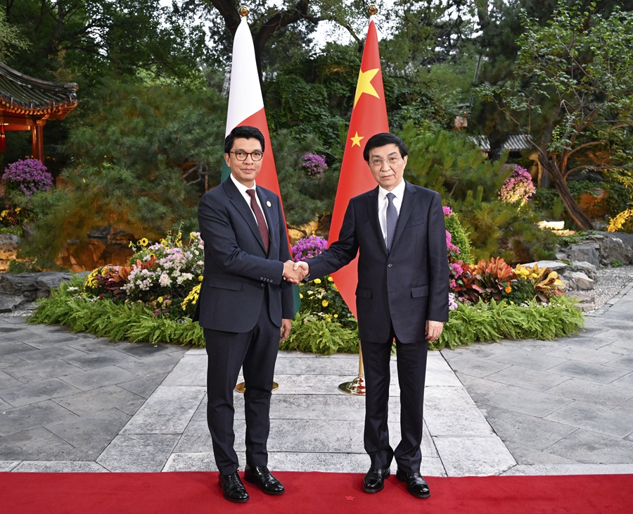 9月6日,全國(guó)政協(xié)主席王滬寧在北京會(huì)見(jiàn)來(lái)華出席中非合作論壇北京峰會(huì)的馬達(dá)加斯加總統(tǒng)拉喬利納。新華社記者 申宏 攝