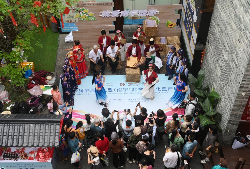 今年“三月三”期間,在南寧市三街兩巷的慶祝活動現場,多彩非遺文化展演吸引游客駐足欣賞。新華社記者陸波岸 攝