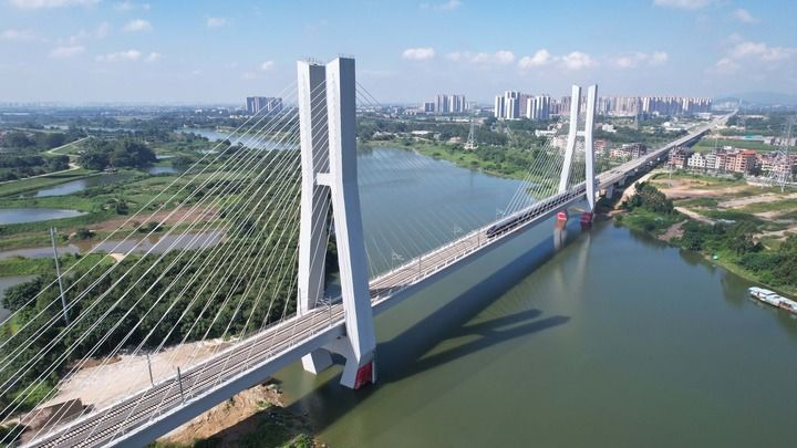 2023年9月26日,廣汕高鐵正式開通運營,列車經過位于廣州市增城區的廣汕高鐵增江特大橋(無人機照片)。新華社記者 田建川 攝