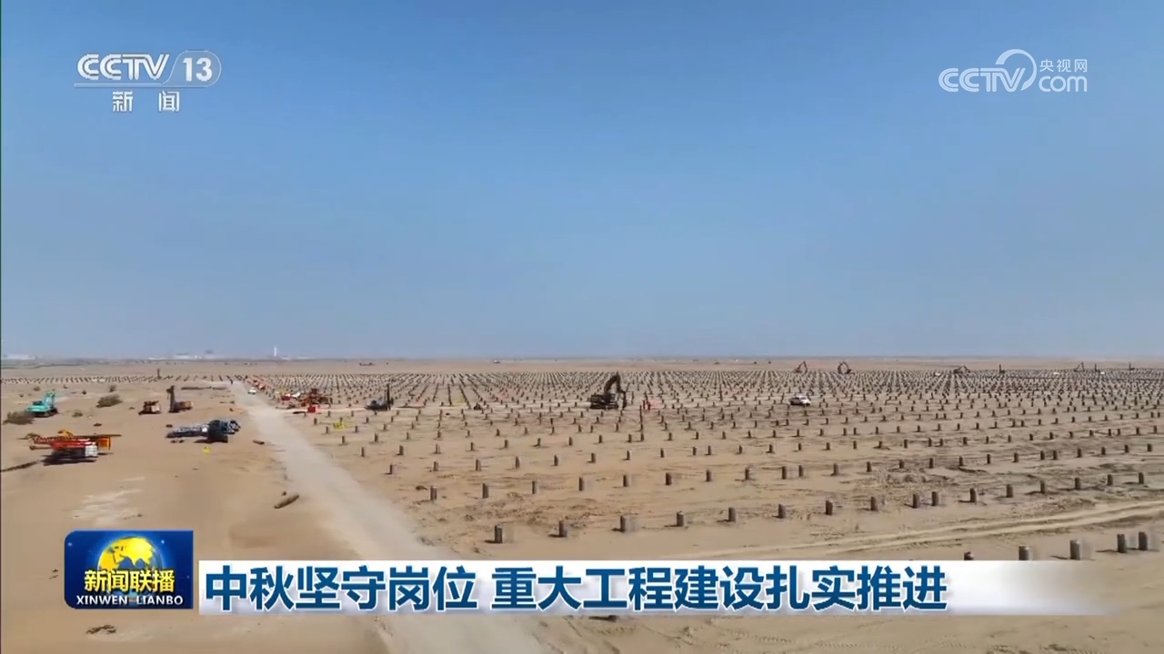 這個中秋假期,在塔克拉瑪干沙漠腹地,上千名施工人員沒有休息,加快建設萬畝光伏治沙項目,他們將用光伏板鋪滿3285個足球場大小的沙丘,年底建成后,將為周邊化工產(chǎn)業(yè)群提供每年21億度的清潔電能。