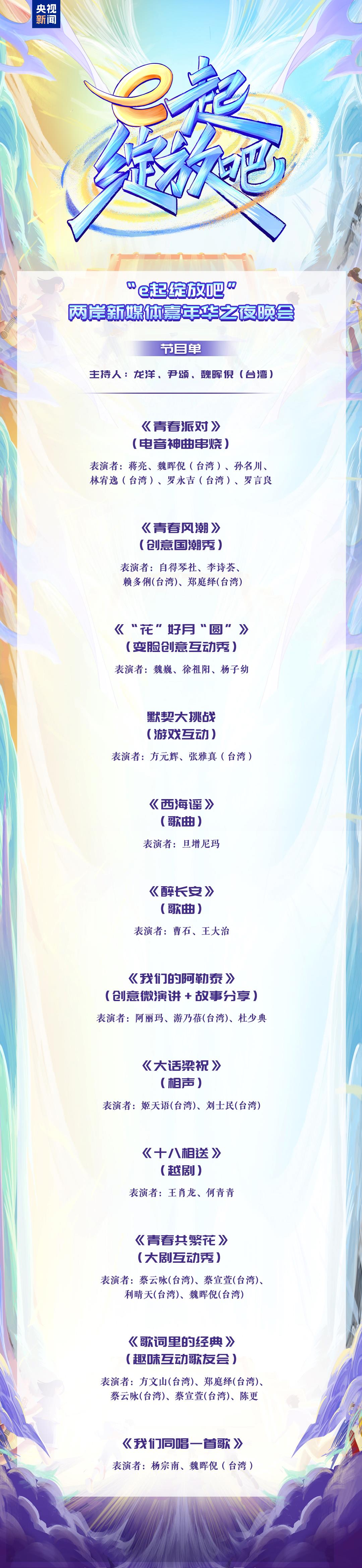 “e起綻放吧”兩岸新媒體嘉年華之夜晚會今晚(9月25日)20時將在看臺海、大灣區(qū)之聲、央視頻、央視新聞、央視財經(jīng)等平臺播出。來自兩岸的文化名人、網(wǎng)紅博主、青年代表以“才藝+故事”的融合表現(xiàn)形式,結(jié)合影視劇、國潮音樂、舞蹈、詩詞歌賦、旅游美食等文化元素,共尋文化記憶、共話青春故事、共融民族情感,共享一場心手相牽的青春盛宴。兩岸年輕人在晚會中同唱一首歌、同追一部劇、同創(chuàng)一首詩,展現(xiàn)兩岸交流交往、融合發(fā)展中的蓬勃青春力量。