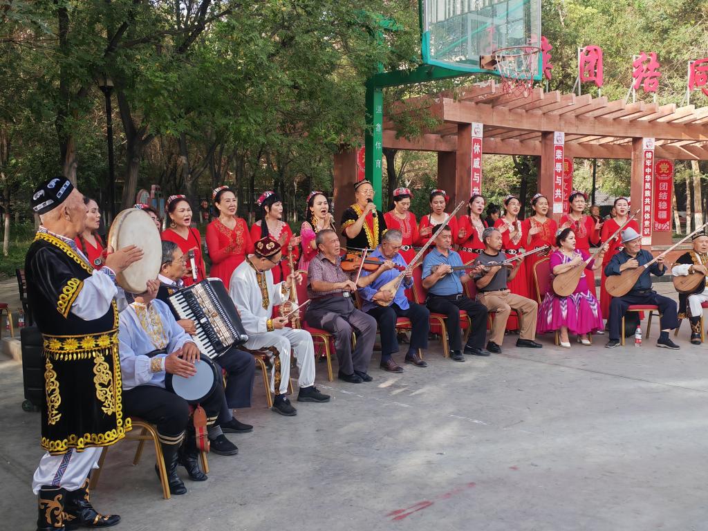 9月19日,庫爾勒市朝陽街道團結社區“石榴籽藝術團”正在為居民們表演。新華社記者顧煜 攝