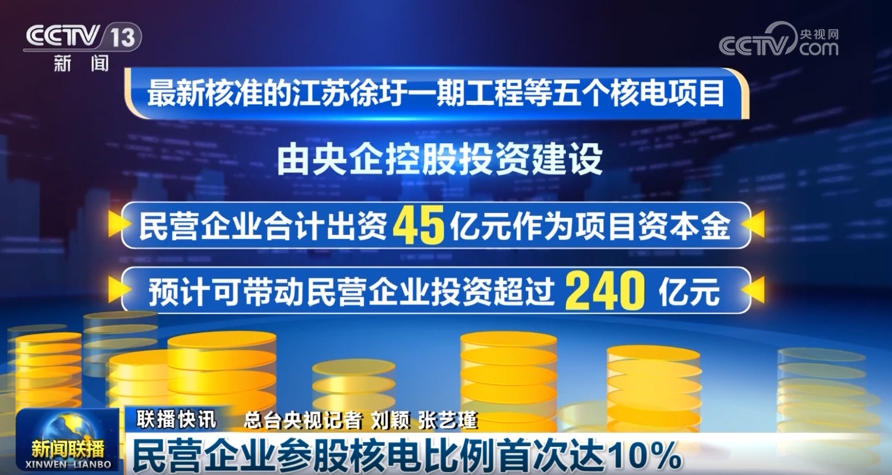 記者從國家發展改革委了解到,近期國務院核準的江蘇徐圩一期工程等五個核電項目,由央企控股投資建設,民營企業合計出資45億元作為項目資本金,預計可帶動民營企業投資超過240億元。民營企業參股核電的比例首次提高到了10%,核電領域進一步向民資放開。