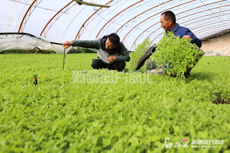 2023年4月17日,新疆生產建設兵團第五師86團一家種植專業合作社大棚育苗基地里,農技人員指導社員管護蔬菜苗。呂羨林攝