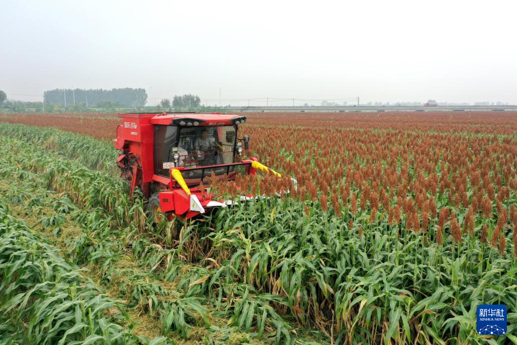 10月7日,在河北省邢臺市南和區和陽鎮東關村,農民駕駛收割機收獲高粱(無人機照片)。新華社記者 王曉 攝