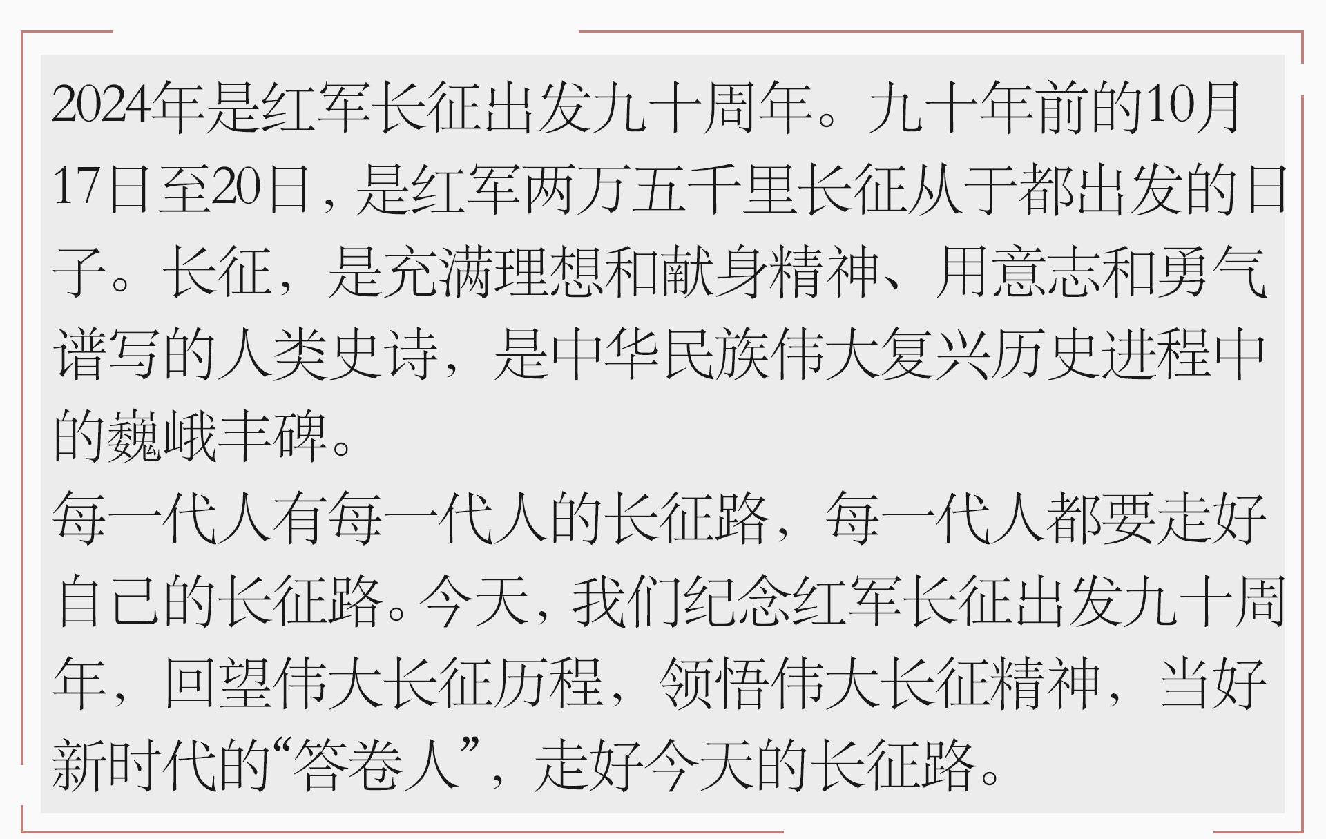 按照日程表的規定,八萬六千多名紅軍戰士向于都集結,準備踏上漫漫征程,在血與火中趟出了一條走向新生、走向勝利的革命道路。