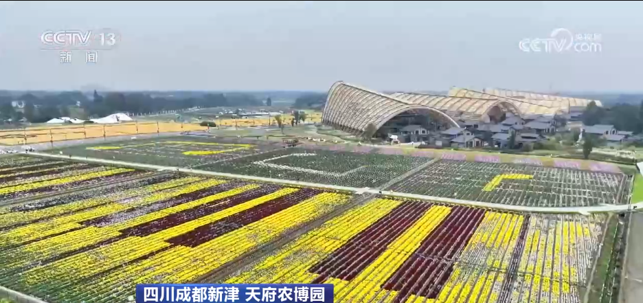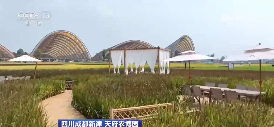 四川成都新津天府農博園里,紫黑、紫紅、金黃三種特種稻種和大田水稻一起組成多彩圖案和造型,每畝預計產量躍上800斤的新高。稻田邊創(chuàng)意涌動,一杯杯稻田咖啡香醇四溢,一朵朵葵花正在向陽綻放,悠然演奏著喜悅豐收的“大地樂章”。